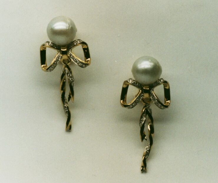 | Orecchini di oro giallo con perle e brillanti realizzato da lastra